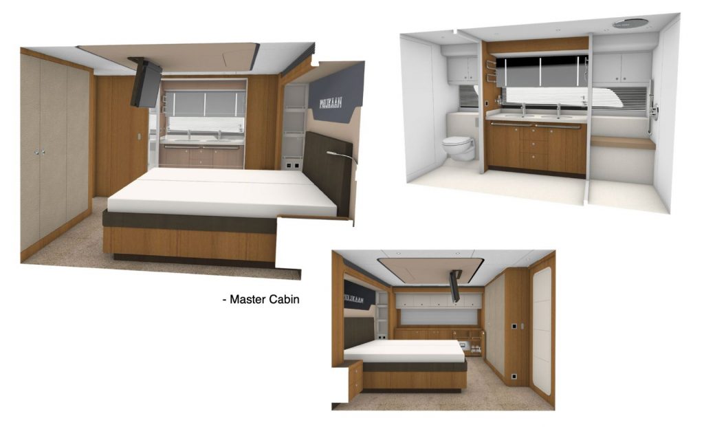An open staircase in the saloon leads to a lower deck lobby, where a washing machine and drier are neatly stored in a cupboard for guest or crew use. The full beam owner’s suite is located aft and its large windows will offer striking views. There is good storage space here and a starboard bathroom with separate toilet and shower.
